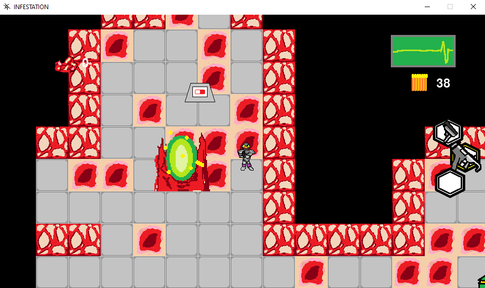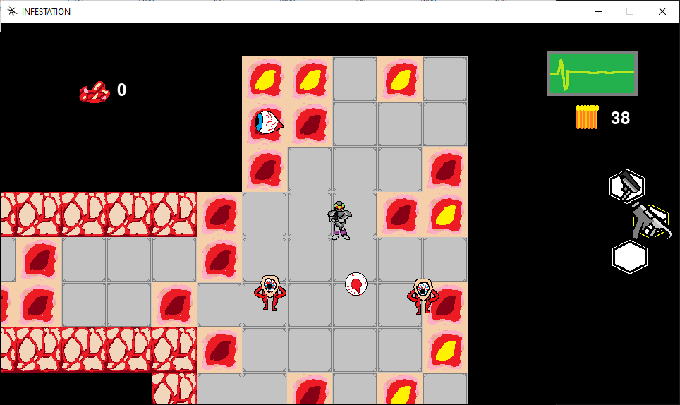 INFESTATION is a fast-paced, arcade-style roguelike where you blast your way through grotesque and deadly abominations in a twisted, flesh-ridden world. Quick reflexes, brutal weapons, and strategic upgrades are your only hope.